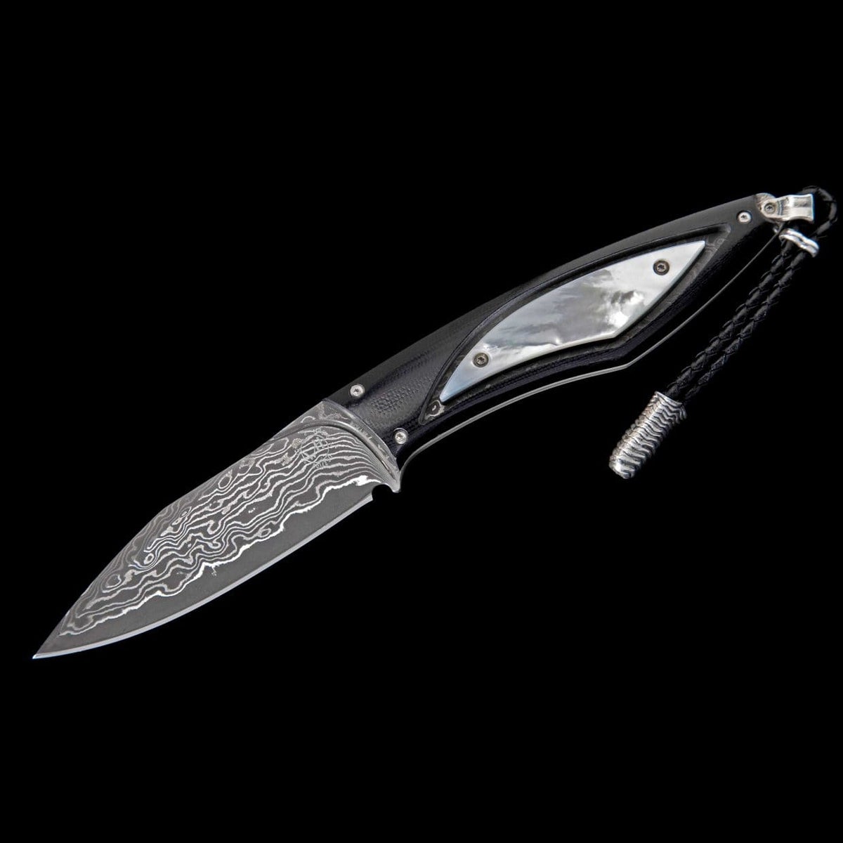 Mother of Pearl set in a hand-polished G10 composite handle. Damascus blade and tang with a VG-10 core.