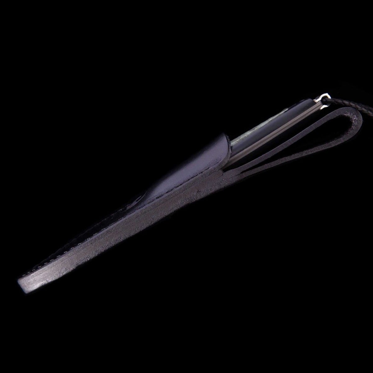 The blade/tang are forged from 67 layers of three alloys, with a core of VG-10 at HRC 60 for optimal sharpness and wear resistance. Finished with a leather lanyard, sterling silver accents, and includes a sturdy black leather sheath.
