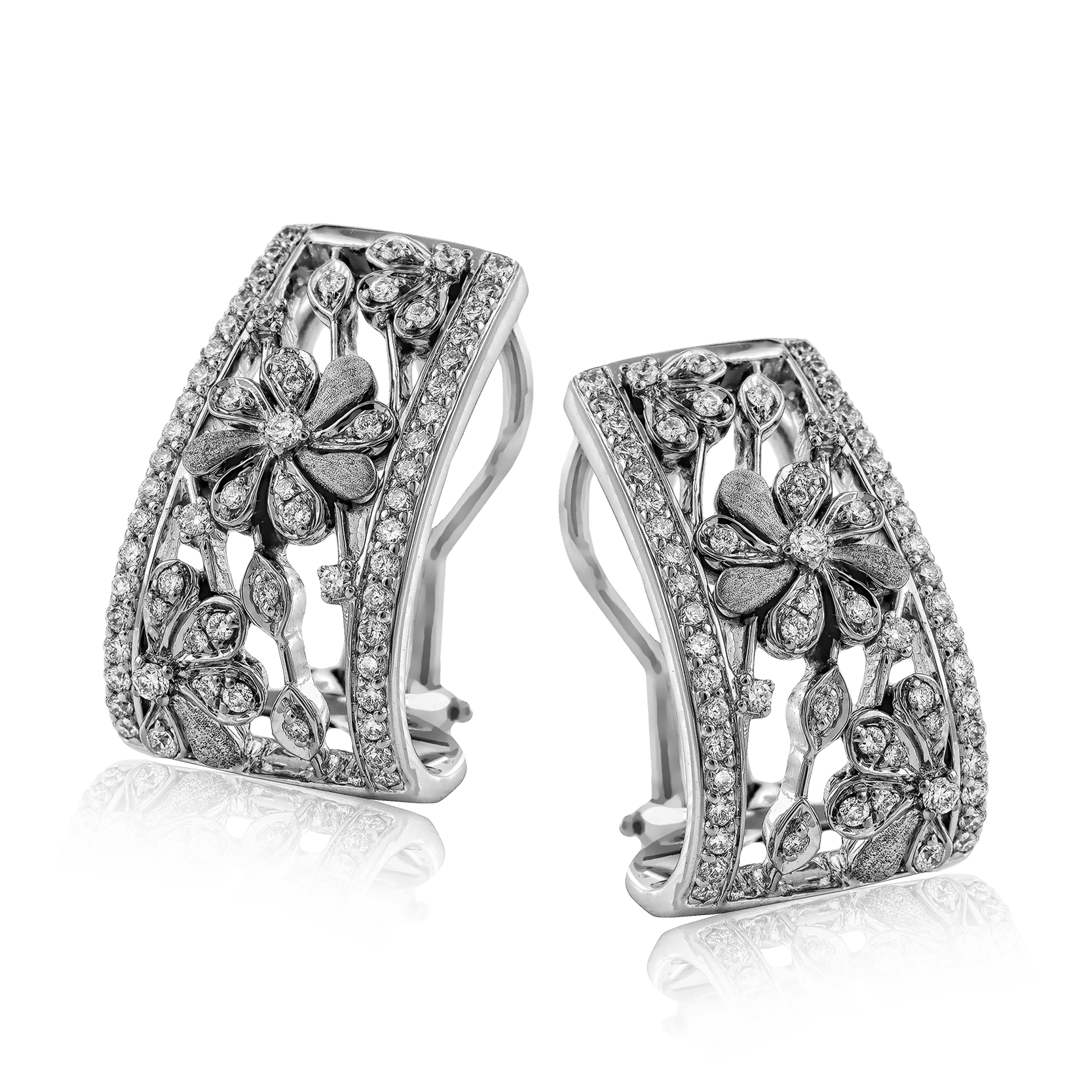 Exquisitely crafted, these two-tone gold earrings feature a lovely floral pattern and contain .74 ctw of white diamonds.