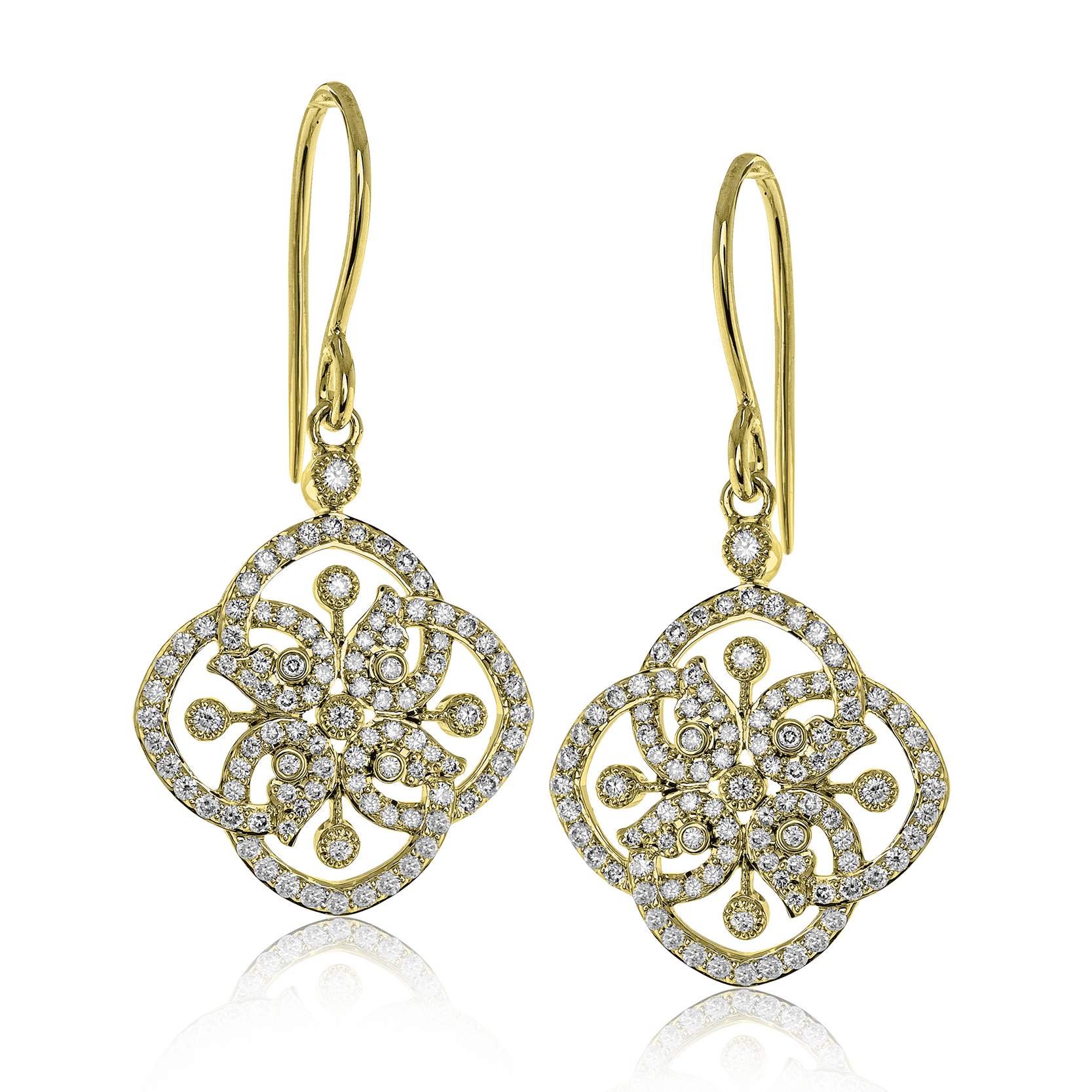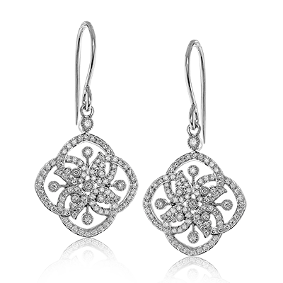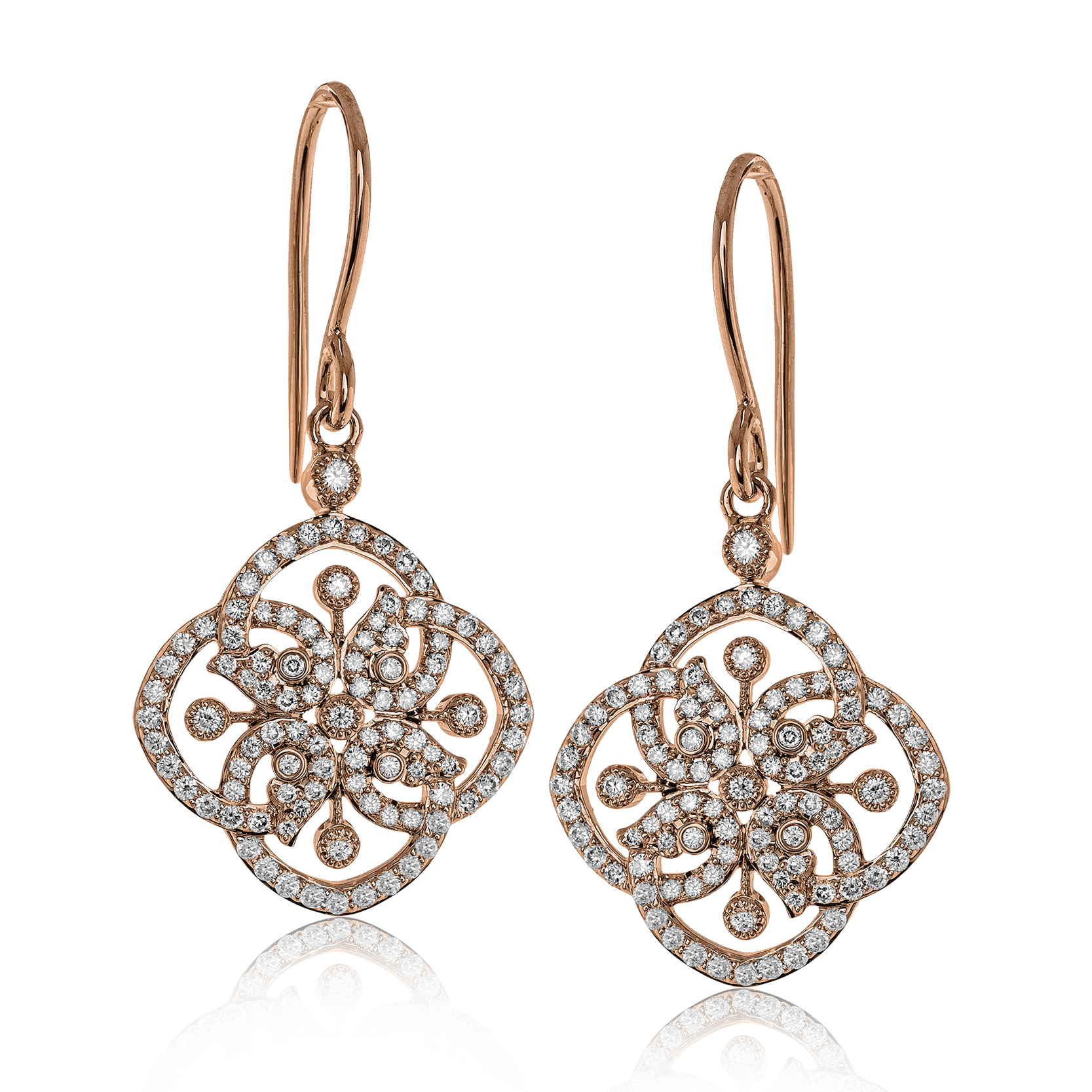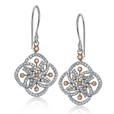 A swirling, intricate design is crafted from 18k rose and white and set with .84 ctw of white diamonds in these exquisite drop earrings.