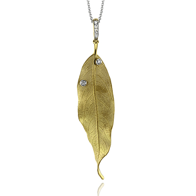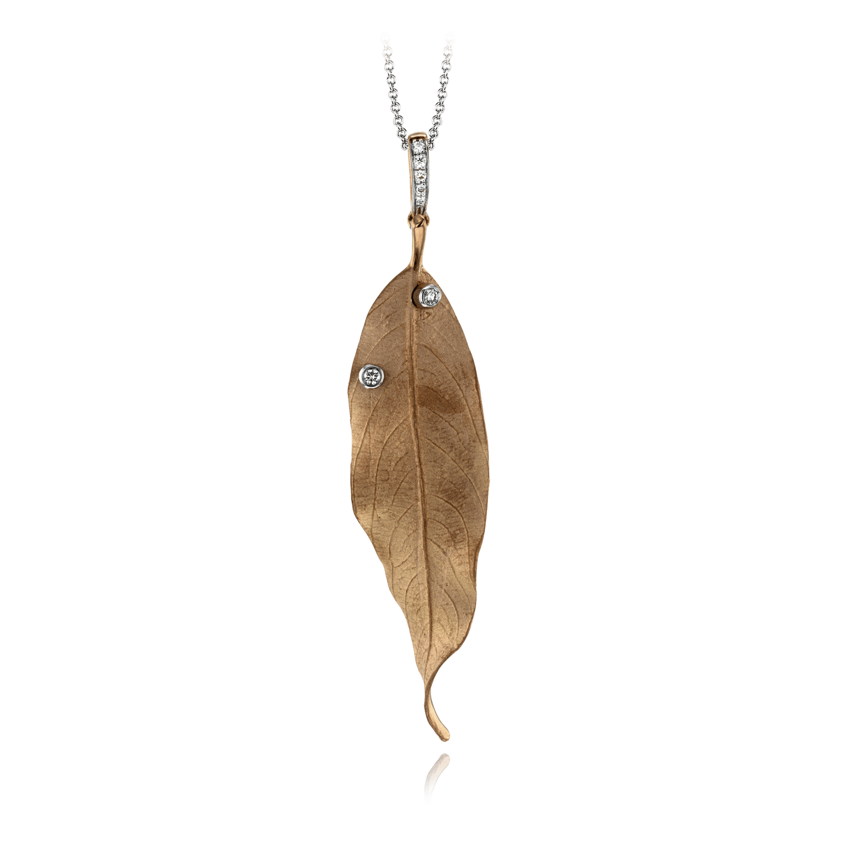 This amazing 18k rose gold pendant captures the beauty of a single leaf in extraordinary detail. a couple of white diamonds totaling .08 ctw add a subtle sparkle.