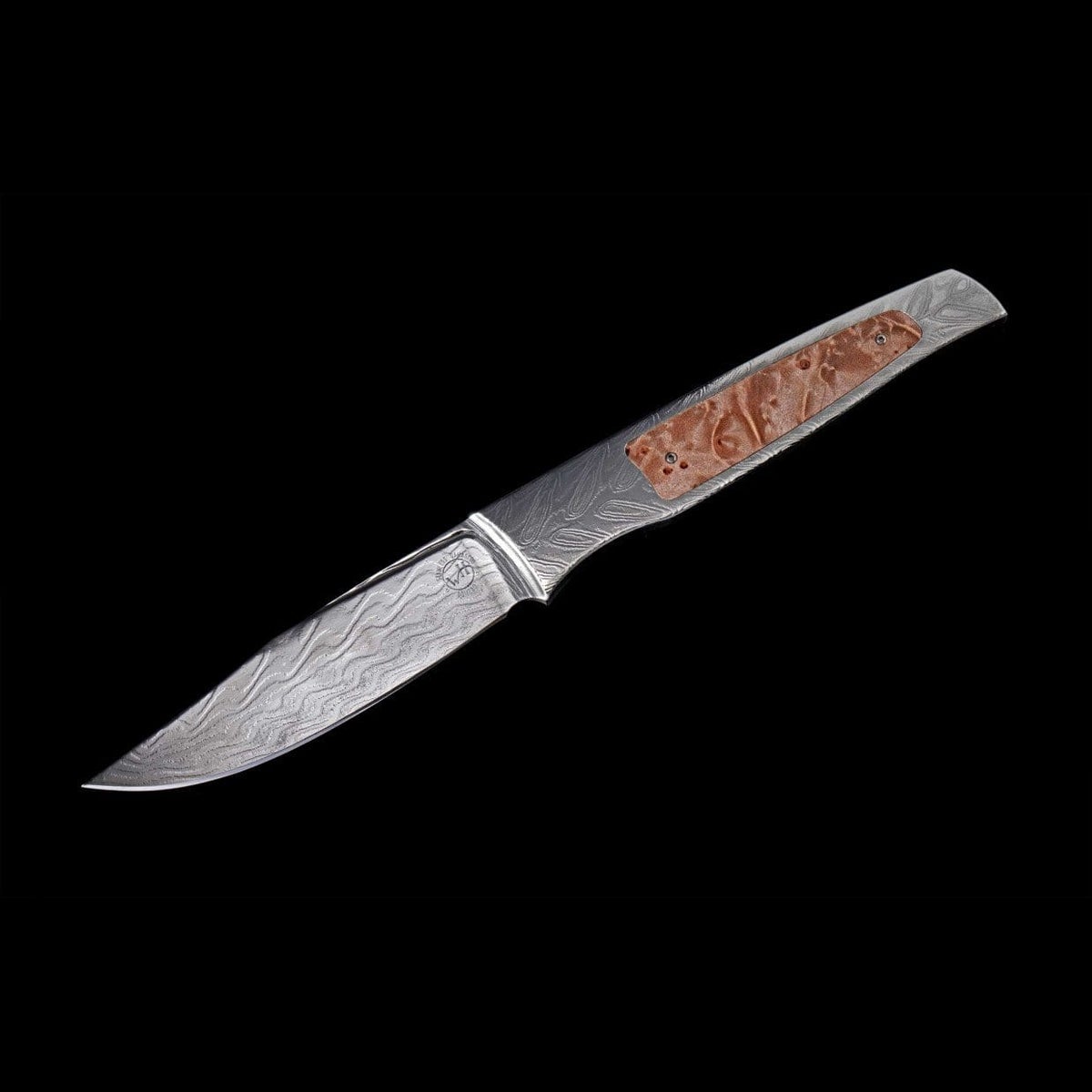 American Maple Burlwood set in stainless damascus steel