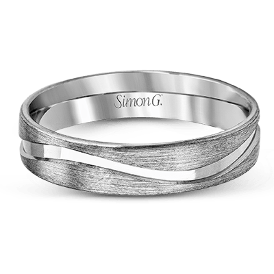 this completely modern men's wedding band boasts a matte white gold design with a contrasting ribbon of polished white gold winding its way around this eye-catching band.