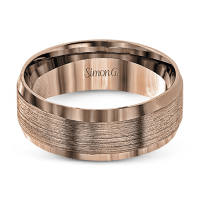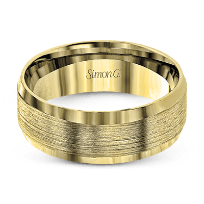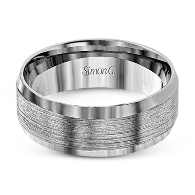 This men's band has beveled edges and a brushed texture extending around the ring.