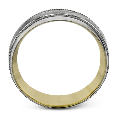 A textured white gold exterior conceals a rose gold interior accent in this elegant, modern wedding band