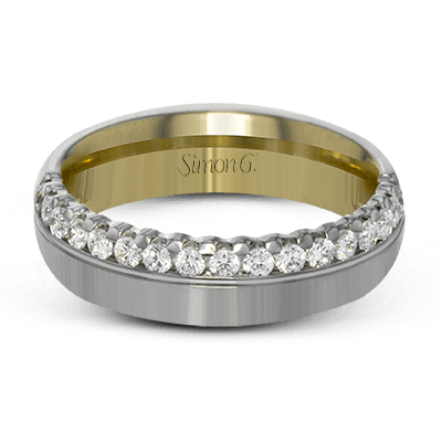 This modern unisex band features a statement row of diamonds totaling .47 ctw along one edge of the ring. the outside of the ring is crafted in white gold while the inside is rose gold.