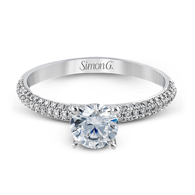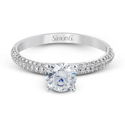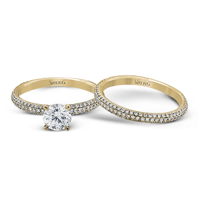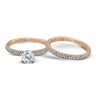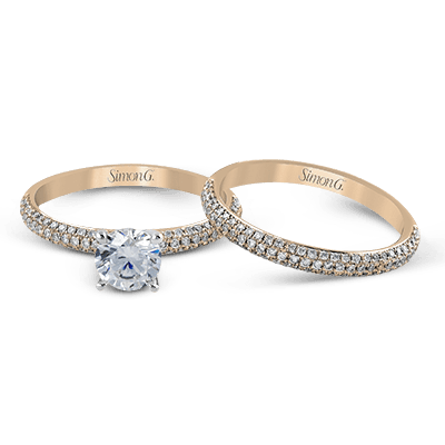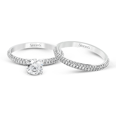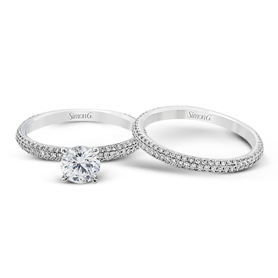 Reflecting a simple yet elegant classic design, this white gold engagement ring and band is accented by .86 ctw white diamonds.