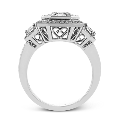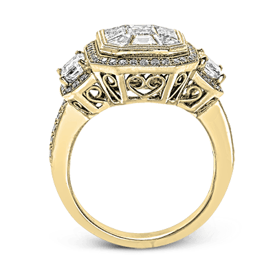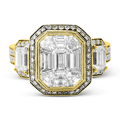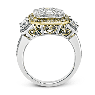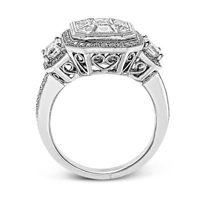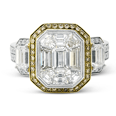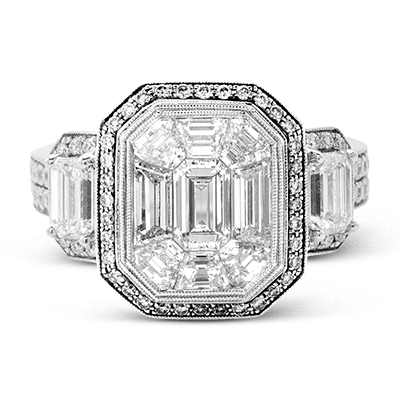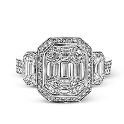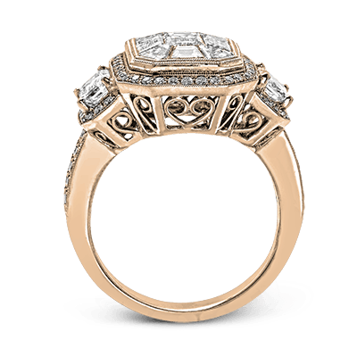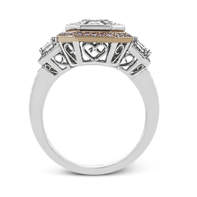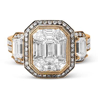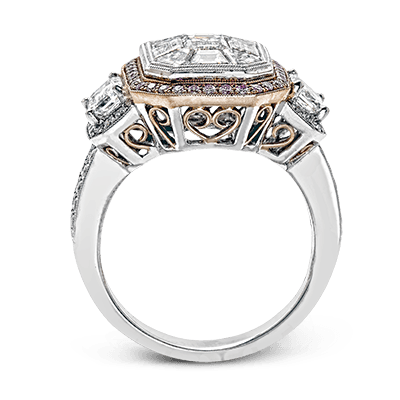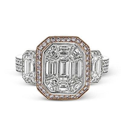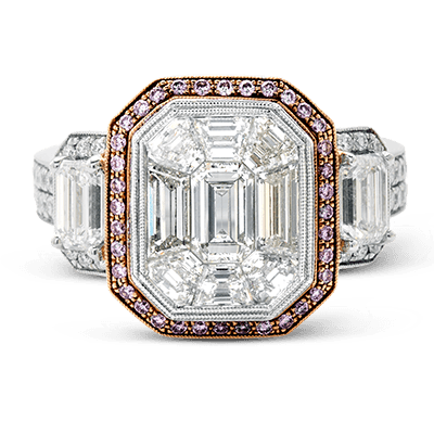 This brilliant white and rose gold contemporary ring is accentuated by a 2.0 ctw center mosaic of white diamonds, complemented by .30 ctw round cut white diamonds, .77 ctw emerald cut white diamonds, and .18 ctw round pink diamond accents.