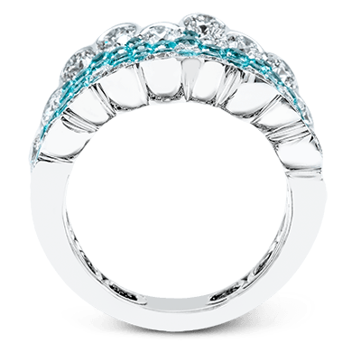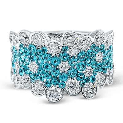 Presenting a dazzling contemporary design, this white gold ring is set with 2.96 ctw of stunning white diamonds and 1.43 ctw eye-catching paraiba tourmaline stones.