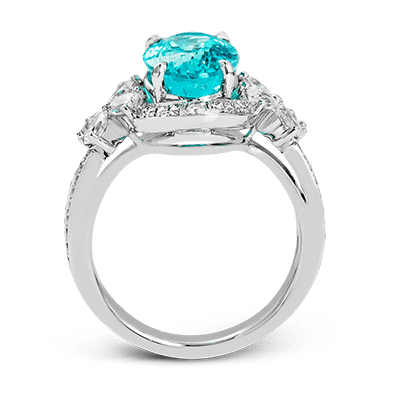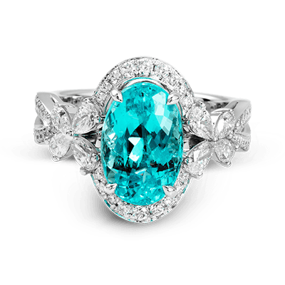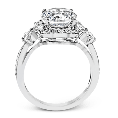 Dramatic yet romantic, this exquisite white gold engagement ring features .61 ctw of round cut white diamonds highlighted by .58 ctw of pear shaped diamonds in delicate floral motifs.
