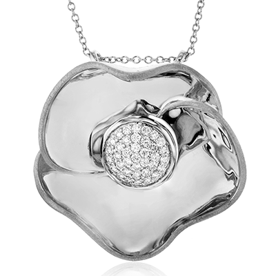 18k rg high polish flower pendant with 0.26ctw cluster of diamonds in it's center, & suspended on a white gold chain