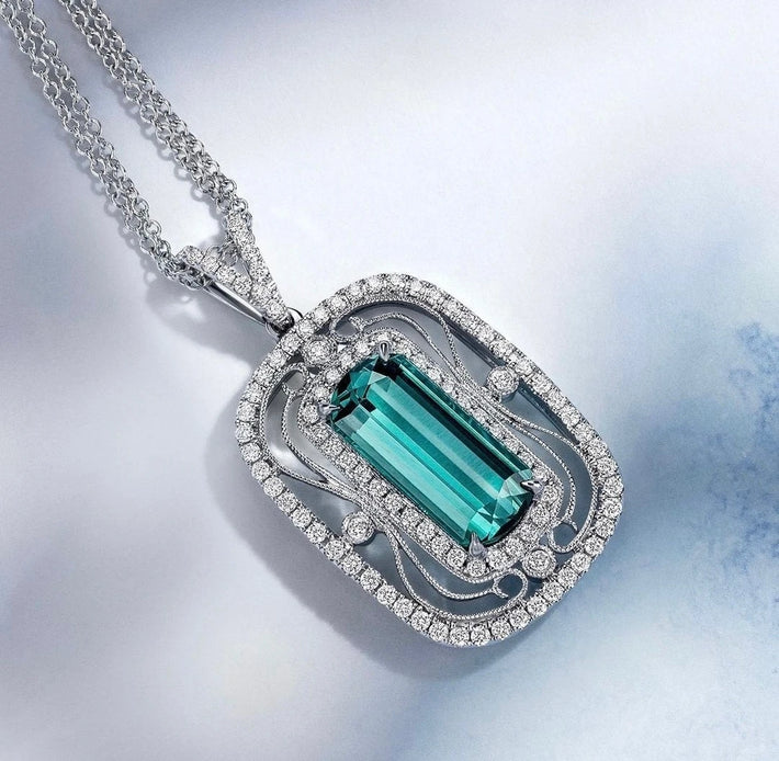 Reflecting a distinctive design, this elegant pendant is set with .38 ctw baguette cut diamonds, .08 ctw round cut pink diamonds. and .20 ctw round cut white diamonds.