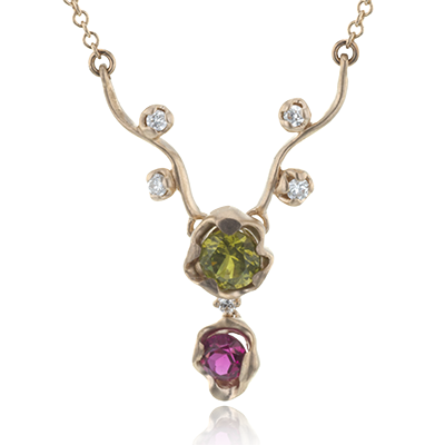 Like a floral wreath for the neck, this organic 18k rose gold necklace includes a .28 ct green tsavorite garnet and a lively pink .13 ct spinel.