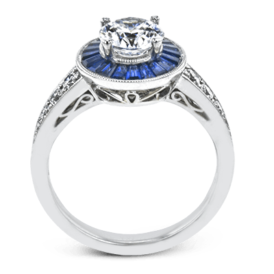 This 18k white gold engagement ring add something special with .56 ctw of baguette sapphires in a halo around the center stone. a total of .36 ctw of white diamonds finish this remarkable design.