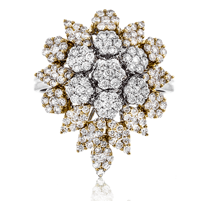 This opulent 18k white and yellow gold right hand fashion ring recalls old hollywood glamour with a whopping 2.06 ctw of white diamonds set in a floral design.