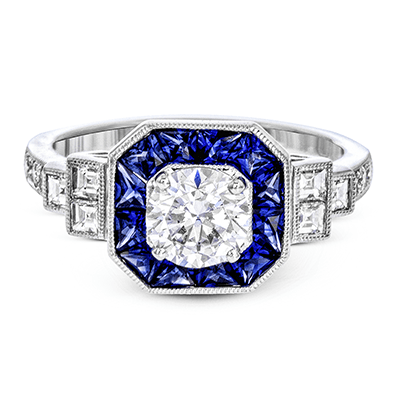 This 18k white gold engagement setting would be a perfect 'something blue' with .79 ctw of baguette sapphires in a halo surrounding the center stone. these are framed by .33 ctw of princess cut diamonds and .11 ctw of round brilliant diamonds.