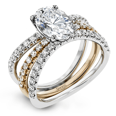 This distinctive bridal set design features a double-layer wedding band that fits around the engagement ring. the set contains .77 ctw of white diamonds.