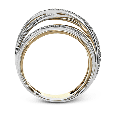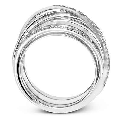 This modern, dynamic ring features an overlapping design of shiny high polished 18k white gold and rows of sparking white diamonds. the ring contains .50 ctw of round diamonds.