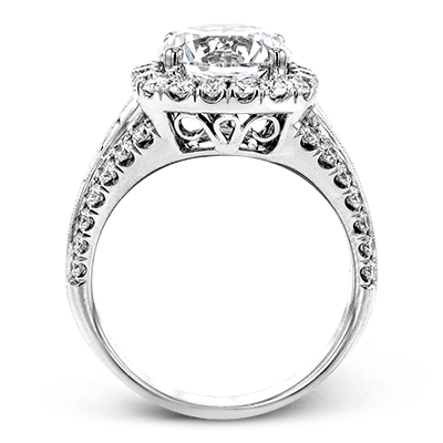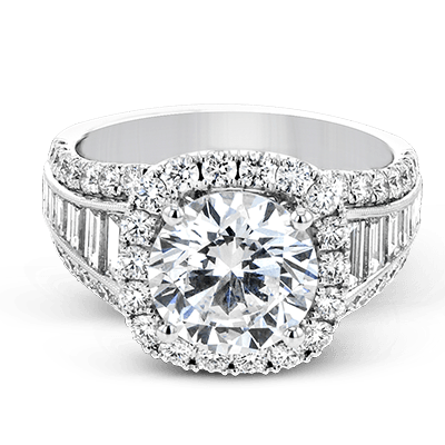 This show-stopping halo design contains .88 ctw of round diamonds along with a whopping 1.03 ctw of baguette cut diamonds.