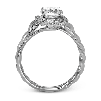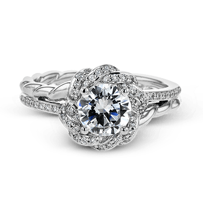 This contemporary engagement ring design features a modern twist design with a halo containing .19 ctw of white diamonds.