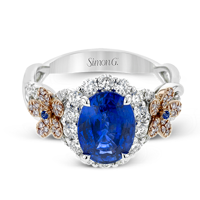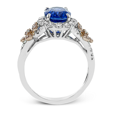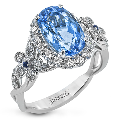 This ornate, intricate ring features .70 ctw of round white diamonds and 4.00 ctw of sapphires in a beautiful floral-inspired setting