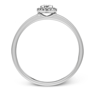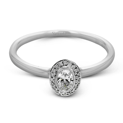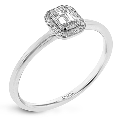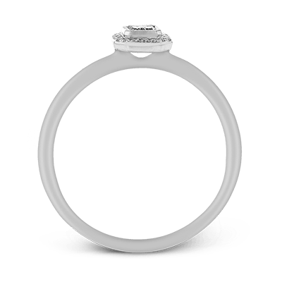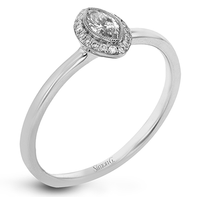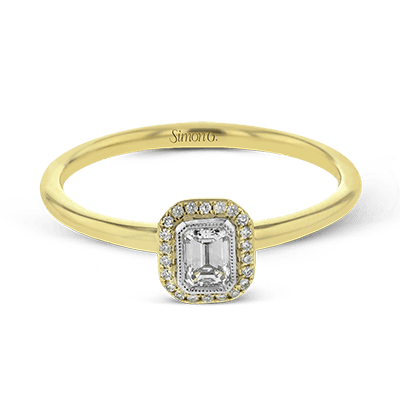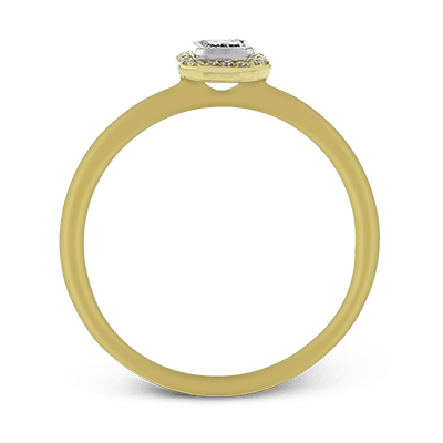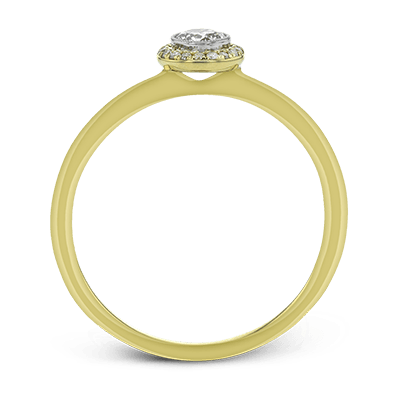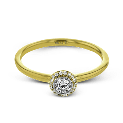 This exquisite, minimalist yellow gold ring features a halo containing .04 ctw of round white diamonds encircling a .16 ctw round white diamond centerpiece