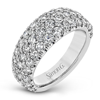 A classic staple, the cornerstone of any jewelry wardrobe, this 18k white gold ring featuring 3cttw brilliant diamonds set using simon g's pattented technique exudes class.