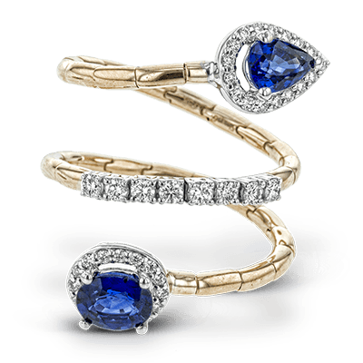 1.40 ctw of sapphires sparkle at the ends of this comfortable, segmented rose gold coil, with .38 ctw of round white diamonds glimmering in white gold accents.