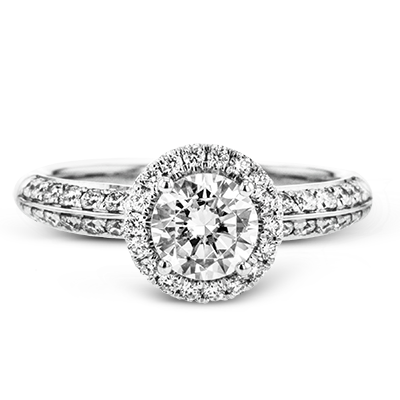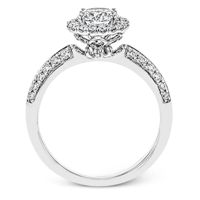 This delicate, vintage-inspired engagement ring sparkles with .42 ctw of round white diamonds in its halo and side details, all set in beautiful white gold.