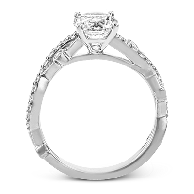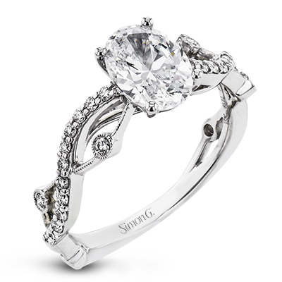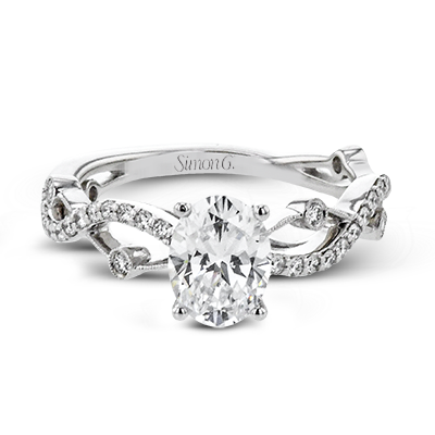 The intertwined design of this 18k gold engagement ring perfectly offsets an oval shaped center stone.