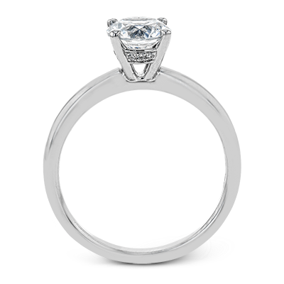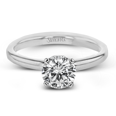 This singular engagement accents the center stone with a touch of .03 ctw of diamonds around the secure basket setting, while the band shines in high polish metal.