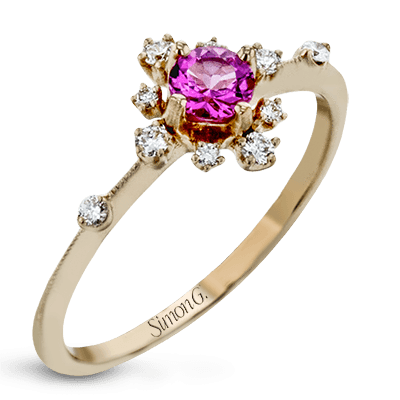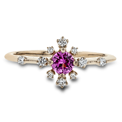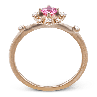 This charming 18k rose gold ring is perfect for stacking and contains a .28 ct center pink spinel stone and .13 ctw accent diamonds.