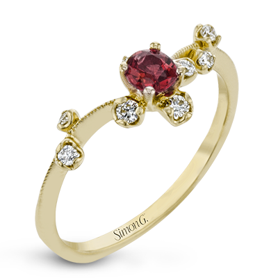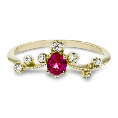 A delightful bright spinel holds center stage in this paradise collection 18k yellow gold, accented by side diamonds.