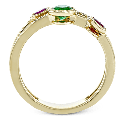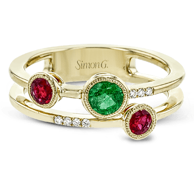This modern 18k yellow gold double-banded ring features several bezel set gemstones including .36 ctw of rubbies, .28 ctw of emeralds, and .04 ctw of accent diamonds.