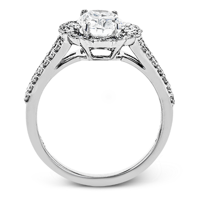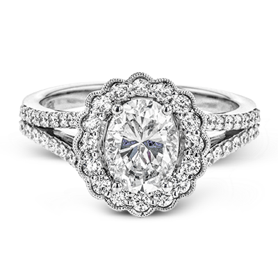 This delightful engagement ring features a scalloped halo that surrounds the center stone like a flower, containing .52 ctw of white diamonds.