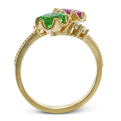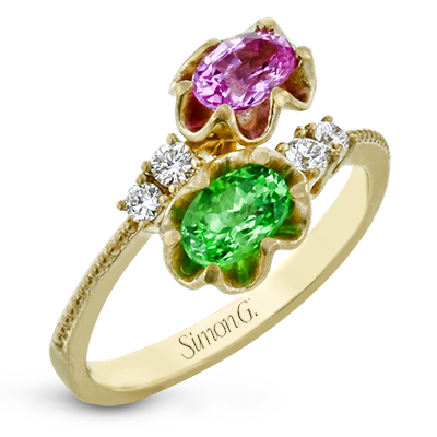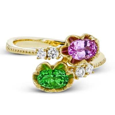 Pink and green combine delightfully in this paradise collection ring that features pink spinel and a green tsavorite garnet.