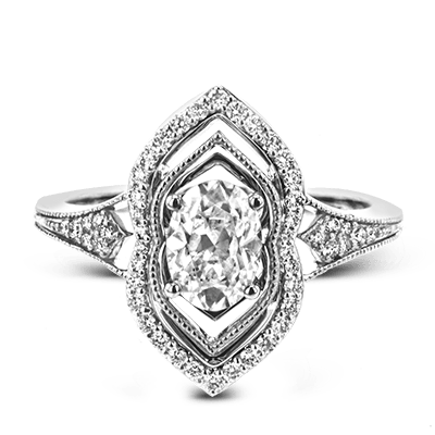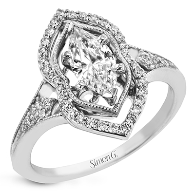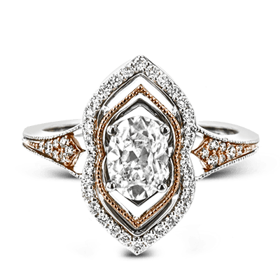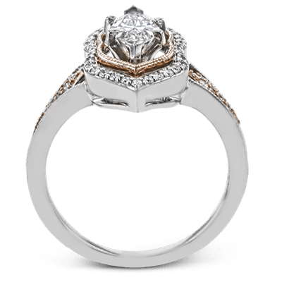 This intricate and unique ring setting is made for a marquise shaped center stone and features .23 ctw of white accent diamonds in 18k white and rose gold.