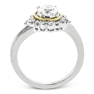 Full of interesting design details, this engagement ring from our supernova collection features a yellow gold milgrain halo around the center stone, and an outer halo set with .20 ctw of white diamonds.