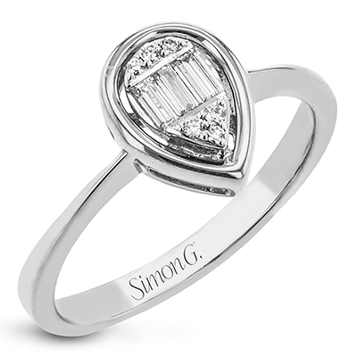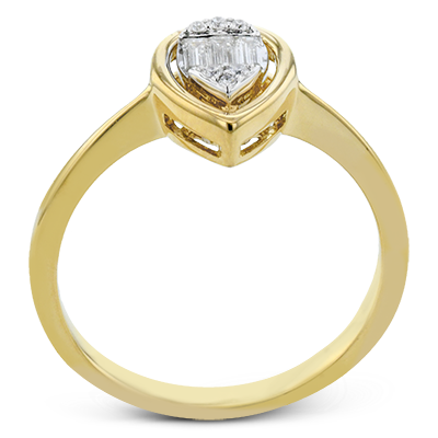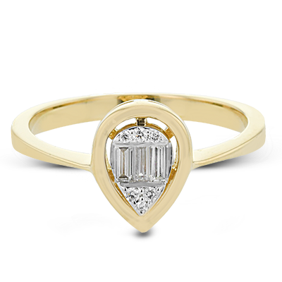 This sleek, modern 18k gold ring features a central pear-shaped mosaic made from .14 ctw baguette diamonds and .03 ctw rounds diamonds.