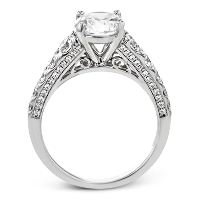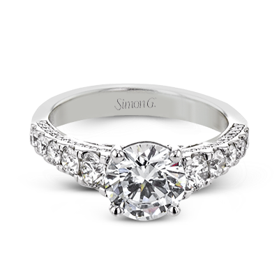 Filigree details underneath the center stone and diamonds that extend down the sides of this ring make it far from ordinary.