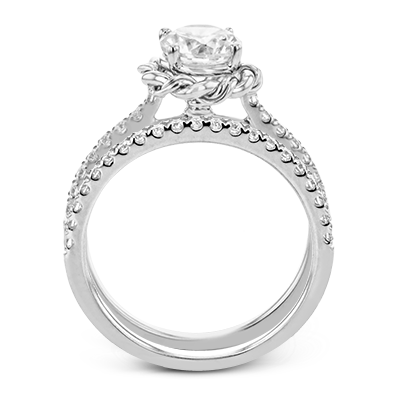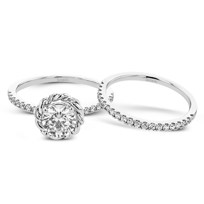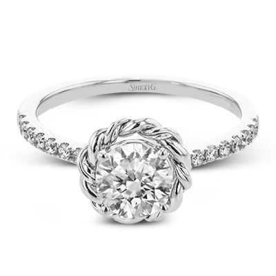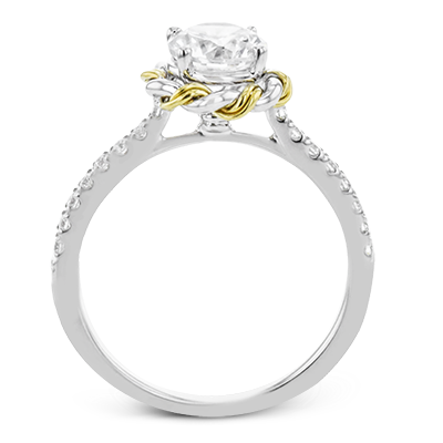 This distinctive engagement ring features .40 ctw of white diamonds on the shank of the ring and a halo made from a twisted design of yellow and white gold.