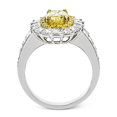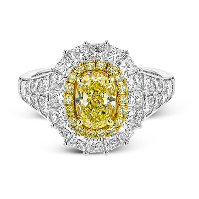 This very special ring is custom crafted for a 1.34 ct oval yellow diamond at the center. this stone is then surrounded by an inner halo of round yellow diamonds and a larger outer halo of princess cut white diamonds.
