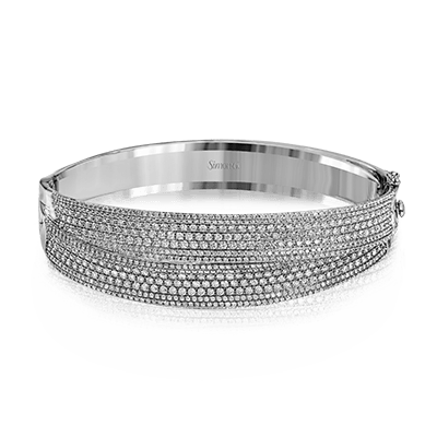 This striking bangle bracelet contains a stunning 4.69 ctw of white diamonds set into a 18k white and rose gold design.