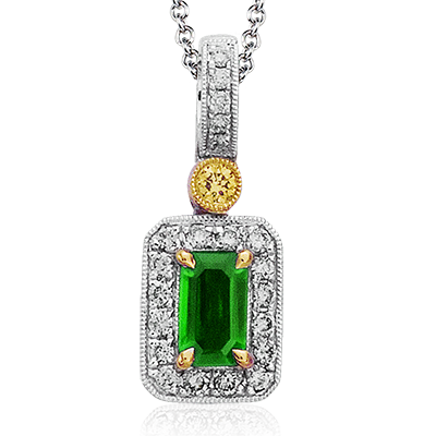 This impressive white and yellow gold classic pendant features an emerald cut emerald accented by .12ctw round white diamonds and a .02ct round cut yellow diamonds.