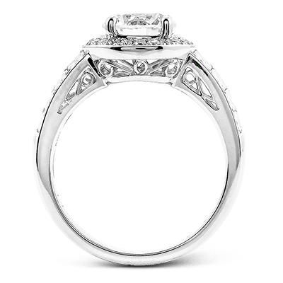 With a beautiful halo surrounding the center stone, this lovely white gold engagement ring is set with 1.14 ctw of shimmering princess cut white diamonds and .20 ctw round cut white diamonds.