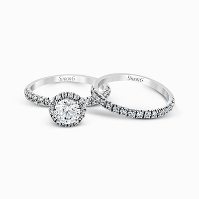the classic halo design of this white gold engagement ring and wedding band are elevated by .80 ctw of shimmering round cut white diamonds.