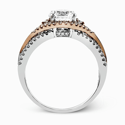Featuring a modern design, this rose and white gold engagement ring and wedding band is highlighted by .51 ctw of round cut white diamonds.