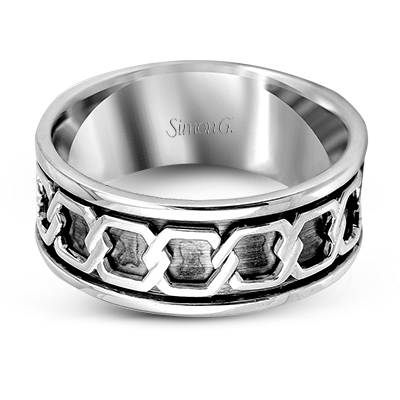 This distinctive wedding band's contrasting white, yellow, and black gold highlight its beautiful interlocking chain detail.