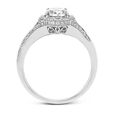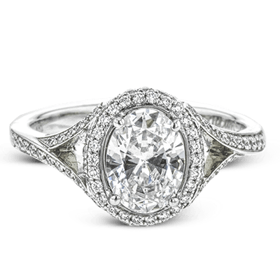 Elegant and sophisticated, this white gold ring's delicate halo and split shank glitter with .28 ctw of round white diamonds to highlight an oval shaped center stone.