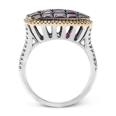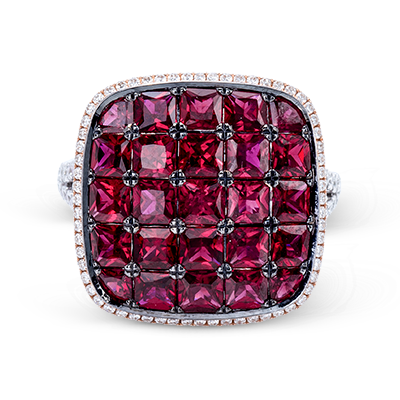 A contemporary wg domed ring with pc rubies 4.70 ctw set in black rhodium, accented by white diamonds .45 ctw in rose gold
